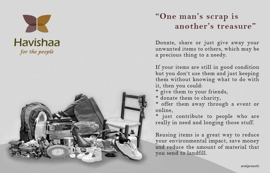 HAVISHAA is my sharing program that turns gently used goods into treasure. Havishaa encourage people to donate and share their used goods by laying a platform and converts them into happiness to the needy.